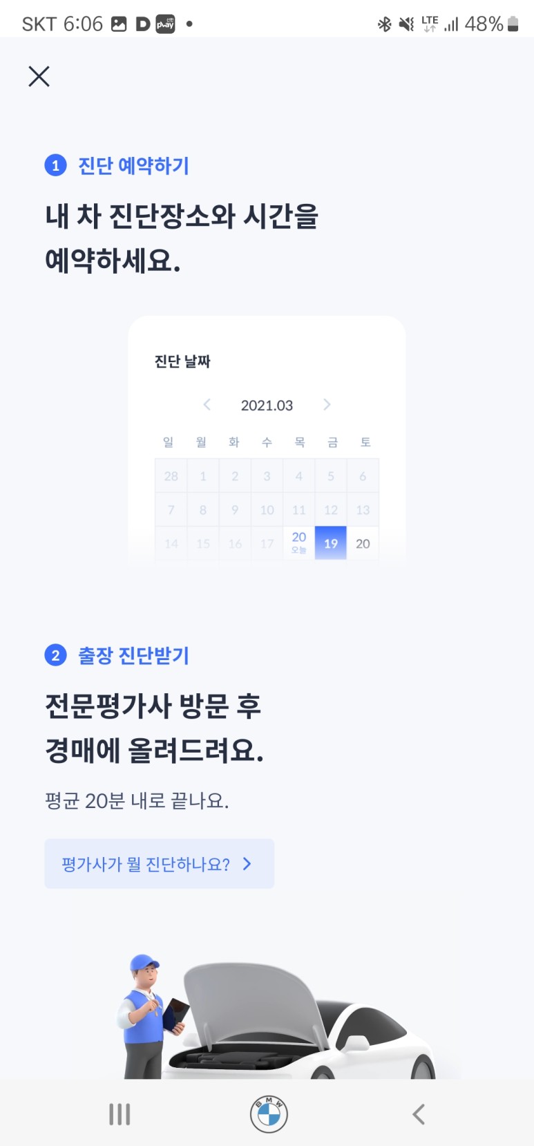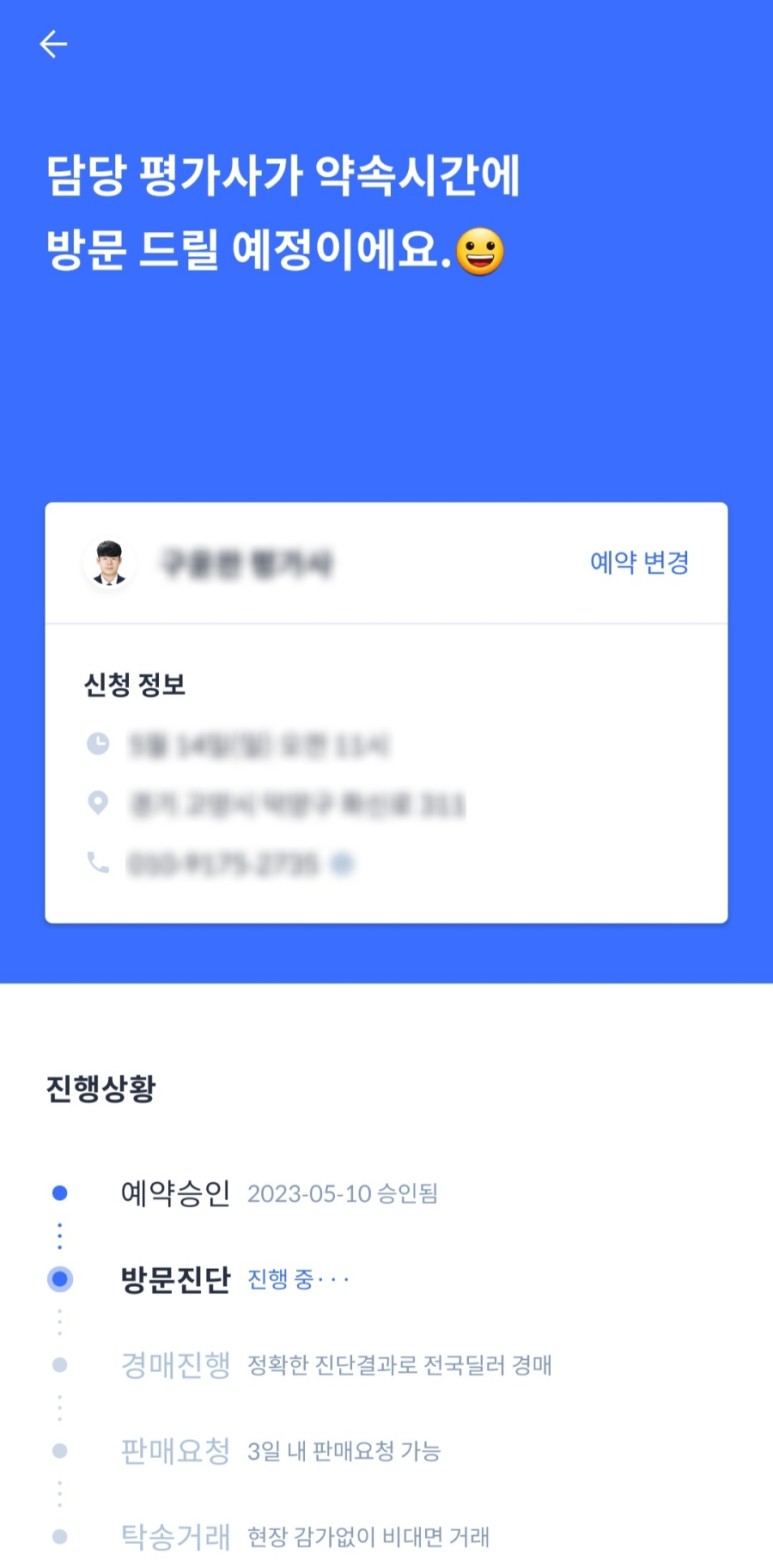 차량 등록을 마쳤다면, 감정평가사 방문 날짜를 정하면 됩니다. 그러면 내 차 진단을 위해 감정평가사가 직접 방문하게 됩니다.
